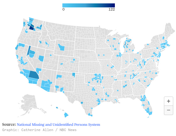 The vast majority of jurisdictions — shown below in gray — have not had a single unclaimed person report in NamUs over the past five years.